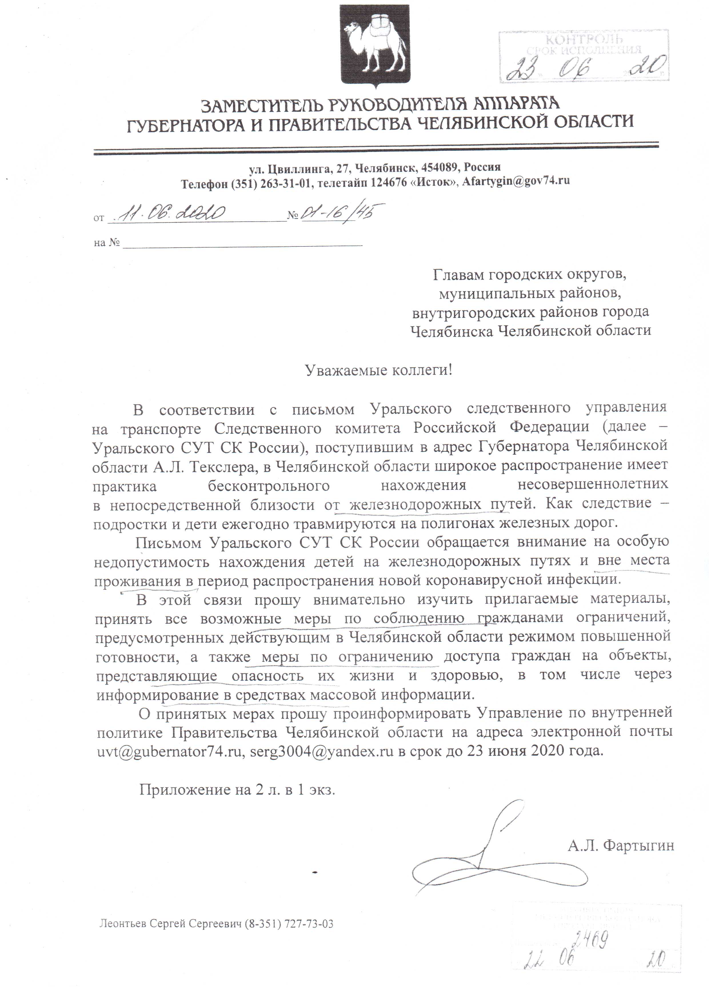 - Письмо Заместителя руководителя Аппарата Губернатора и Правительства Челябинской области "О мерах профилактики среди несовершеннолетних граждан на объектах, представляющих опасность их жизни и здоровью, в том числе, бесконтрольного нахождения в непосредственной близости на полигонах железнодорожных дорог"